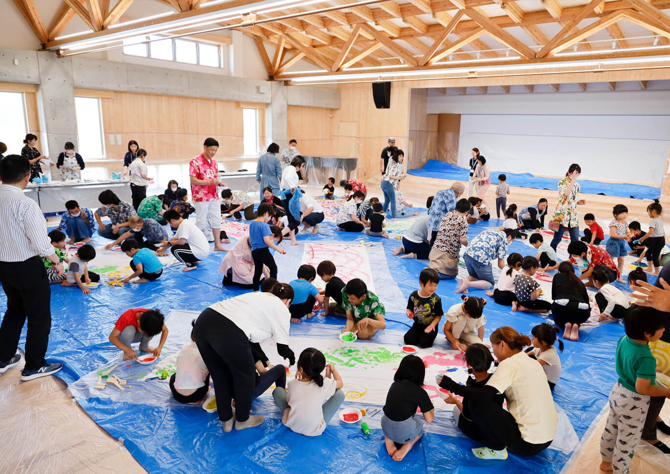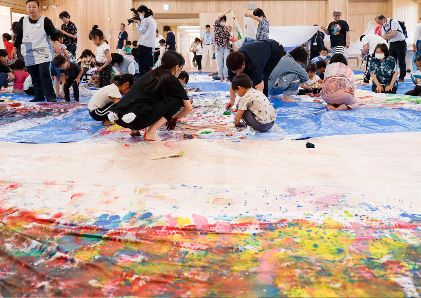 最初は「子どもたちは落ち着いて描けるだろうか」「建物を汚してしまわないか」といった不安もありました。けれど絵の具が広がると、そんな心配はすぐに消えていきます。子どもたちは手や足に色をのせて思い切り表現し、障がいのある方の隣で笑い声をあげながら筆を動かしました。互いに寄り添い合う姿に、会場は温かい空気で包まれました。